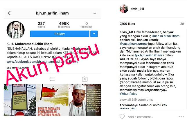 “Halo teman-teman, banyak yang mengira akun ig @k.h.m.arifin.ilham adalah asli, bahkan ustadz @yusufmansurnew juga follow akun itu, saya yang merupakan anak dari kandung dari ‘Muhammad Arifin Ilham’ menyatakan kalo akun @k.h.m.arifin.ilham adalah AKUN PALSU! Ayah saya hanya mempunyai akun Facebook dan tidak mempunyai akun instagram ataupun akun sosial media lain nya, mohon kerja sama kalian untuk unfollow (jika yang sudah follow) , blokir, dan lapor (report) karena membuat akun palsu dengan mengatasnamakan orang lain, terimakasih atas kerja samanya #AkunPalsu,” tulis Alvin.