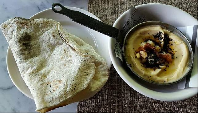 Hummus terbuat dari olahan kacang arab (chickpeas), olive oil, air lemon, lada dan garam. Hummus disajikan sebagai saus untuk cocolan roti pita. Unik ya!