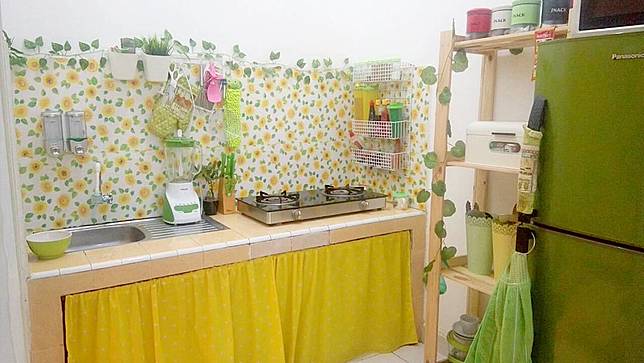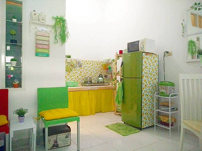 8. Dapur mini terletak di pojok ruangan. Tanpa perlu kabinet, dapur justru tidak nampak terlalu sesak.