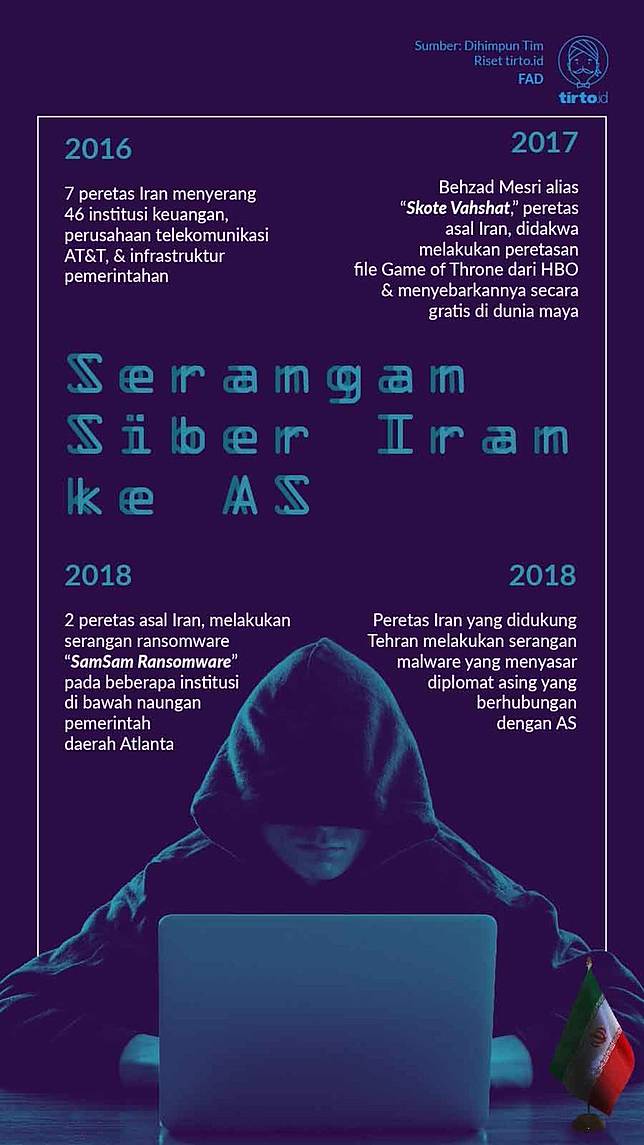 Pada 2016, misalnya, Reuters melaporkan tujuh peretas Iran sukses menyusup pada 46 institusi keuangan di AS, termasuk JPMorgan Chase, Wells Fargo, hingga American Express. Selain itu, para peretas juga sukses masuk ke sistem Bowman Avenue Dam di Rye Brook, New York, sebagai salah satu infrastruktur vital negeri Paman Sam tersebut.