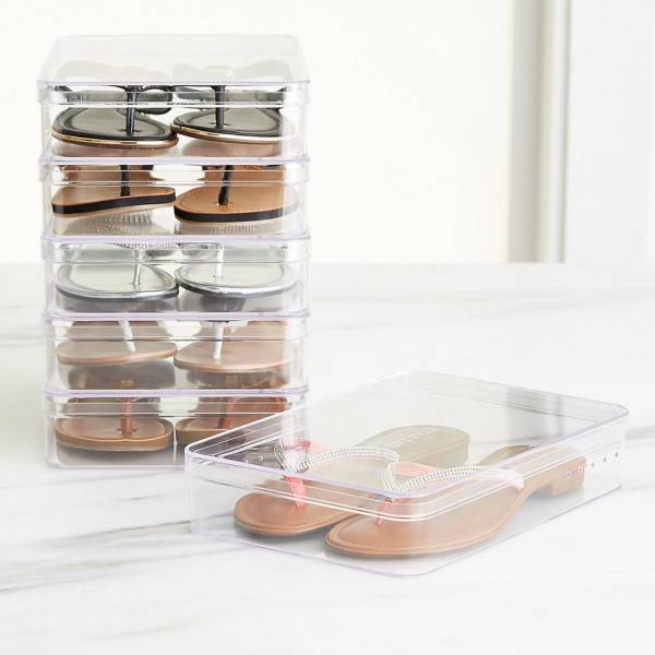 3. Simpan koleksi sandal-sandalmu menggunakan kotak transparan berbahan plastik yang bisa tumpuk dengan rapi ke atas. Kini kamu tidak perlu kesulitan lagi mencari sandal yang ingin kamu gunakan tanpa harus membuatnya berantakan