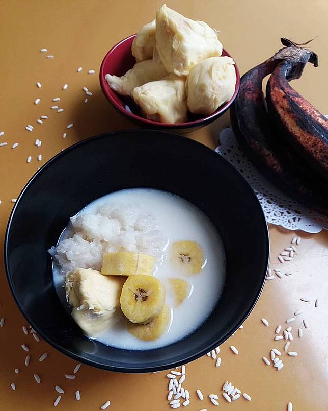 • Tempatkan ketan dalam mangkuk, tuang kuahnya, dan beri isian pisang dan durian.
