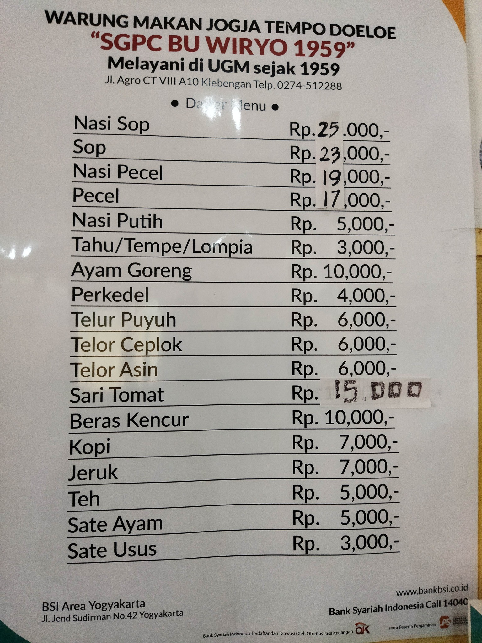 Tidak ada papan nama. Tapi semua mahasiswa UGM paham. Rata-rata pada tahu kalau nama pemiliknya adalah ‘Bu Wiryo’ ketika SGPC pindah ke pinggir selokan Mataram dan memasang papan bertulis ‘SGPC Bu Wiryo’. Tahunya berdiri sejak 1959 pun dari papan nama itu.
