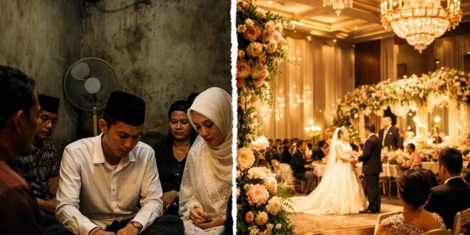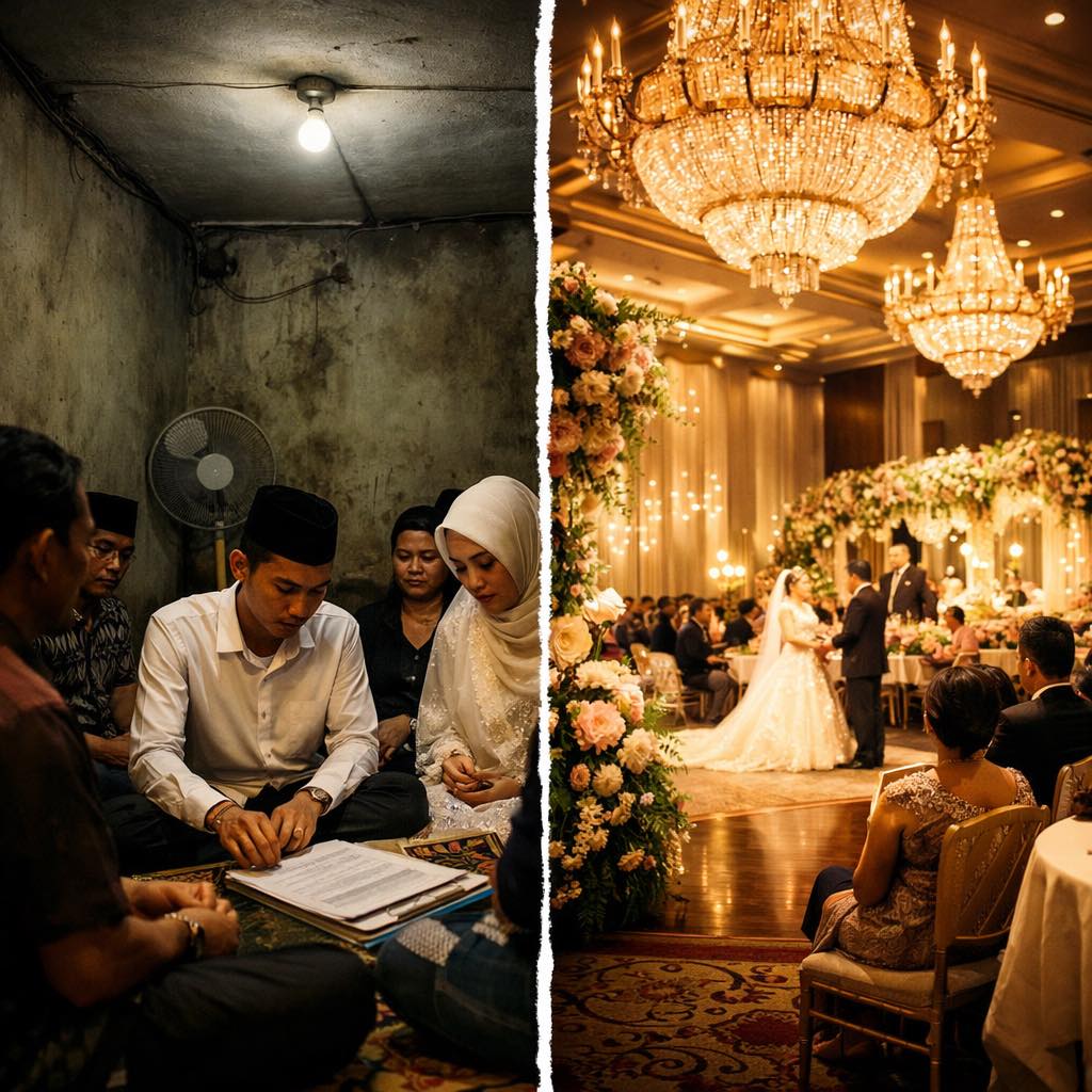 Hari itu saya menyaksikan dua pernikahan dari dua sahabat; dua dunia yang sangat kontras. Siang hari saya trenyuh oleh baju lusuh; malamnya saya terpana oleh gemerlap.